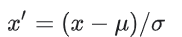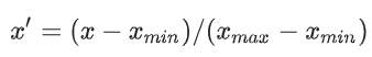 : 예를 들어 100부터 900까지의 값을 갖는 데이터를 일반적인 표준 범위(대개 0부터 1까지, 종종 -1부터 1까지)로 변경하는 것이고 식은 다음과 같다