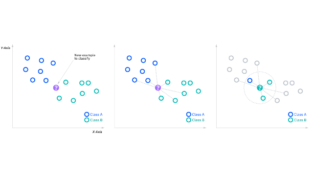 아래를 다이어그램 예시인데, 보라색 '?' 데이터 포인트를 할당 할 때 주변엔 Class A인 파란색 데이터 포인트가 하나 Class B인 초록색 포인트가 두 개 있기 때문에 더 많은 Class B로 '?' 데이터 포인트를 할당한다.