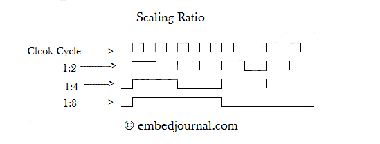 주기를 쪼개, Counter에 공급되는 클락을 더 느리게 만들어주는 장치다. Timer에 공급되는 여러 클락이 하나로 합쳐져 Timer가 더 느리게 동작하게 된다.