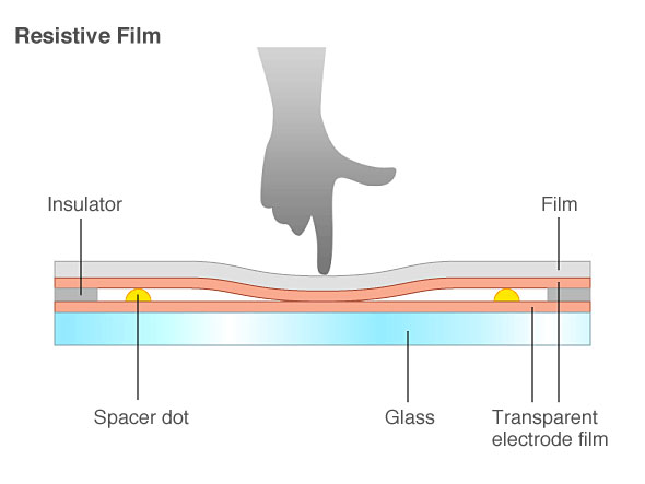 저항식 터치스크린은 압력 감도를 기반으로 작동한다. 내구성이 뛰어나고 장갑, 스타일러스 또는 기타 포인팅 자잋와 함께 사용할 수 있어 산업용 제어 및 POS 시스템을 비롯한 다양한 애플리케이션에 적합하다. 그러나 일반적으로 정전식 터치스크린에 비해 선명도와 감도가 낮고 멀티터치 제스처를 지원하지 않는다. 사진에서도 볼 수 있듯이 Resistive Touchscreen은 예전에 많이 사용되던 기술로 요즘엔 Capacitive Touchscreen (정전식 터치스크린)이 더 보편적으로 사용되고있다.