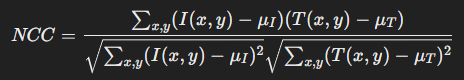 수학적으로 이미지 패치 사이의 NCC는 이미치 패치 I 와 템플릿 T 로 표현하면 아래와 같다.